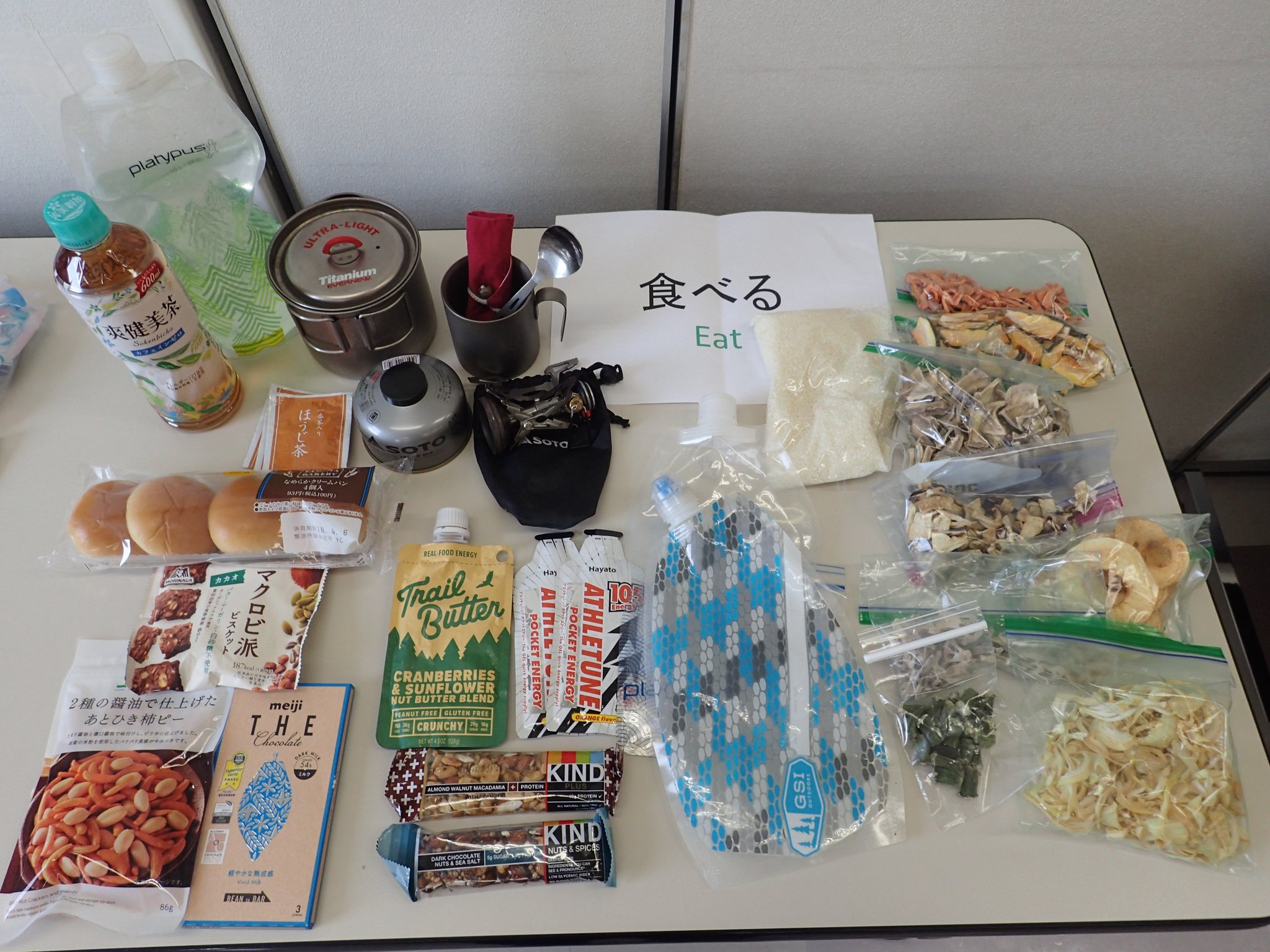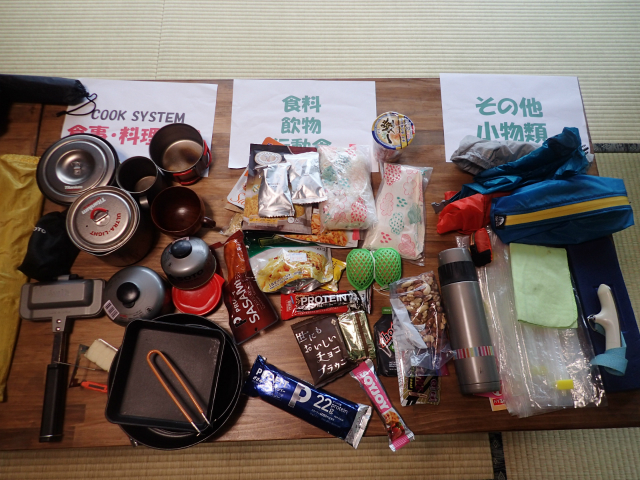 食料・飲み物(下記「食事」参照) 朝食・昼食・行動食★、水★、夕食用の米(アルファ米 or 無洗米)★、お茶・コーヒーなど