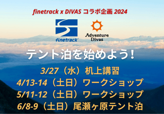 今回のワークショップはファイントラックとの特別コラボイベントです。ご自分のテントをお持ちでない方、もしくはファイントラックの「カミナドーム」テントを試してみたい方は今回無料貸出しがあります。購入前、買い替え前に試してみる良い機会です!(数に限りがあり、先着順となりますのでお申込みはどうぞお早めに!)