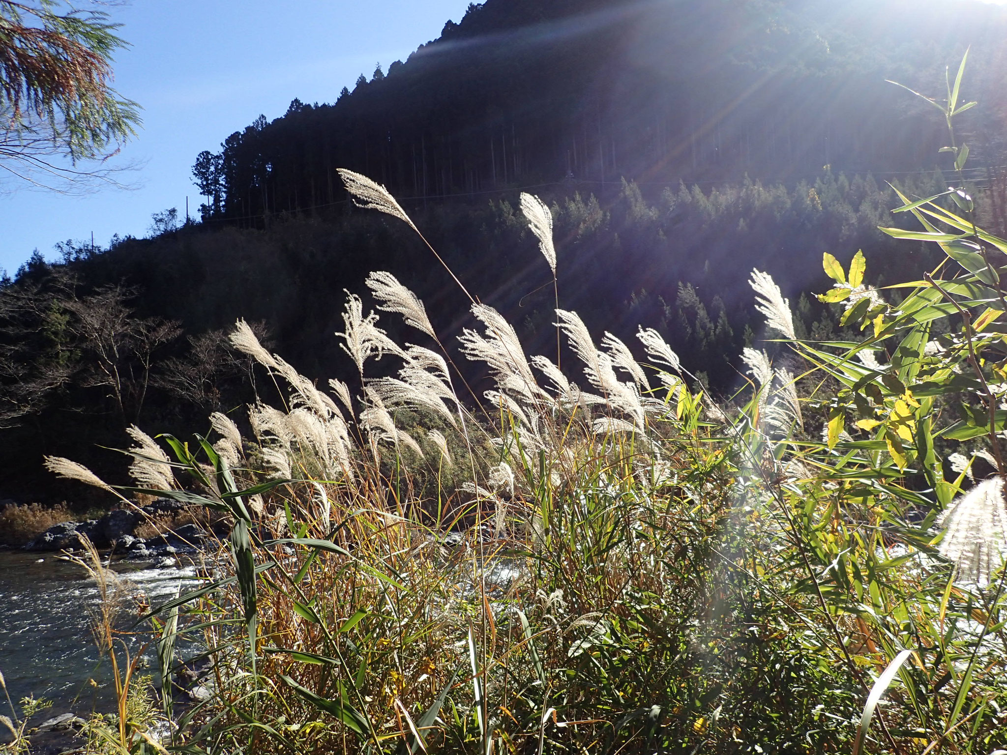 山が真っ赤に染まった素晴らしい紅葉、風にゆらゆら揺れる黄金色に輝くススキ、透き通った空気と真っ青なブルースカイ