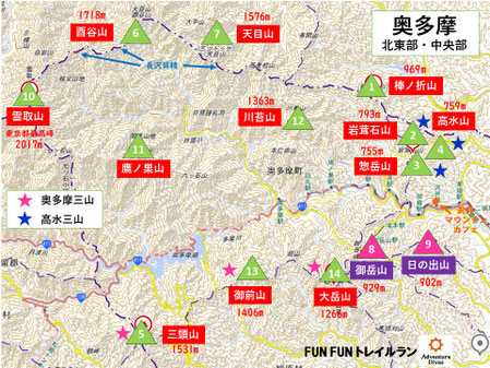今回のコースは古里駅から御岳山まで標高差700mほどを登ります。特に序盤は急登があるためあまり汗をかかないようにゆっくり登りましょう。御岳山山頂にある御岳神社に立ち寄ります。御岳山から日の出山は比較的アップダウンの少ないトレイルです。ハイキングの人が多いので急がずゆっくり行きます。展望の開けている日の出山でのんびり休憩します。日の出山からは下りです高峰山を過ぎると不明瞭な下りトレイルになります。下りを走る練習にもなります。最後は多摩川沿いのロードを走って沢井マウンテンカフェの離れにフィニッシュ~!がんばりましょう!