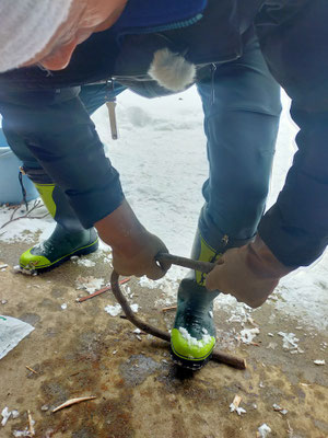 今回のツアーでは、下記写真のような木でできた「わかん」を履いて歩きます。ここで少しだけ、その「わかん」の作り方を紹介します♪