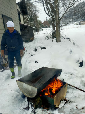 ステップ② 薪を燃やしてお湯を沸かし、沸騰したお湯に木を入れて柔らかくなるまで茹でます。