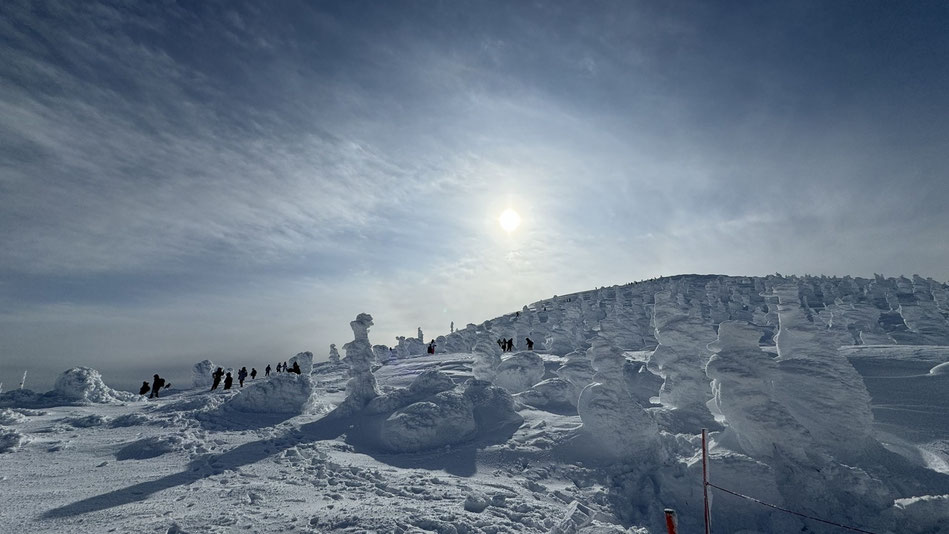まずは雪に包まれた「お地蔵さん」にお参りしてから、「スノーモンスター」の森へ出発です。雪と氷に覆われた木々が立ち並び、まるで白い怪物たちが並んでいるよう!