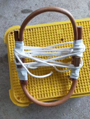ステップ④ 2本の枝を曲げて重ね合わせ、ロープでしっかりと結びます。