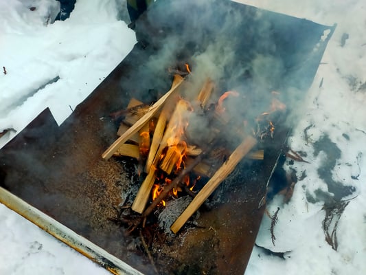 ステップ② 薪を燃やしてお湯を沸かし、沸騰したお湯に木を入れて柔らかくなるまで茹でます。