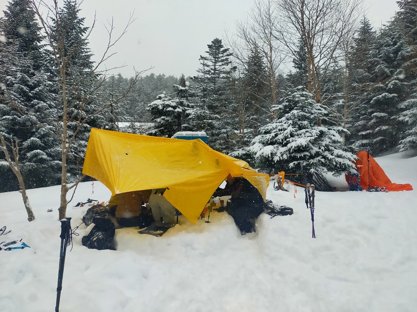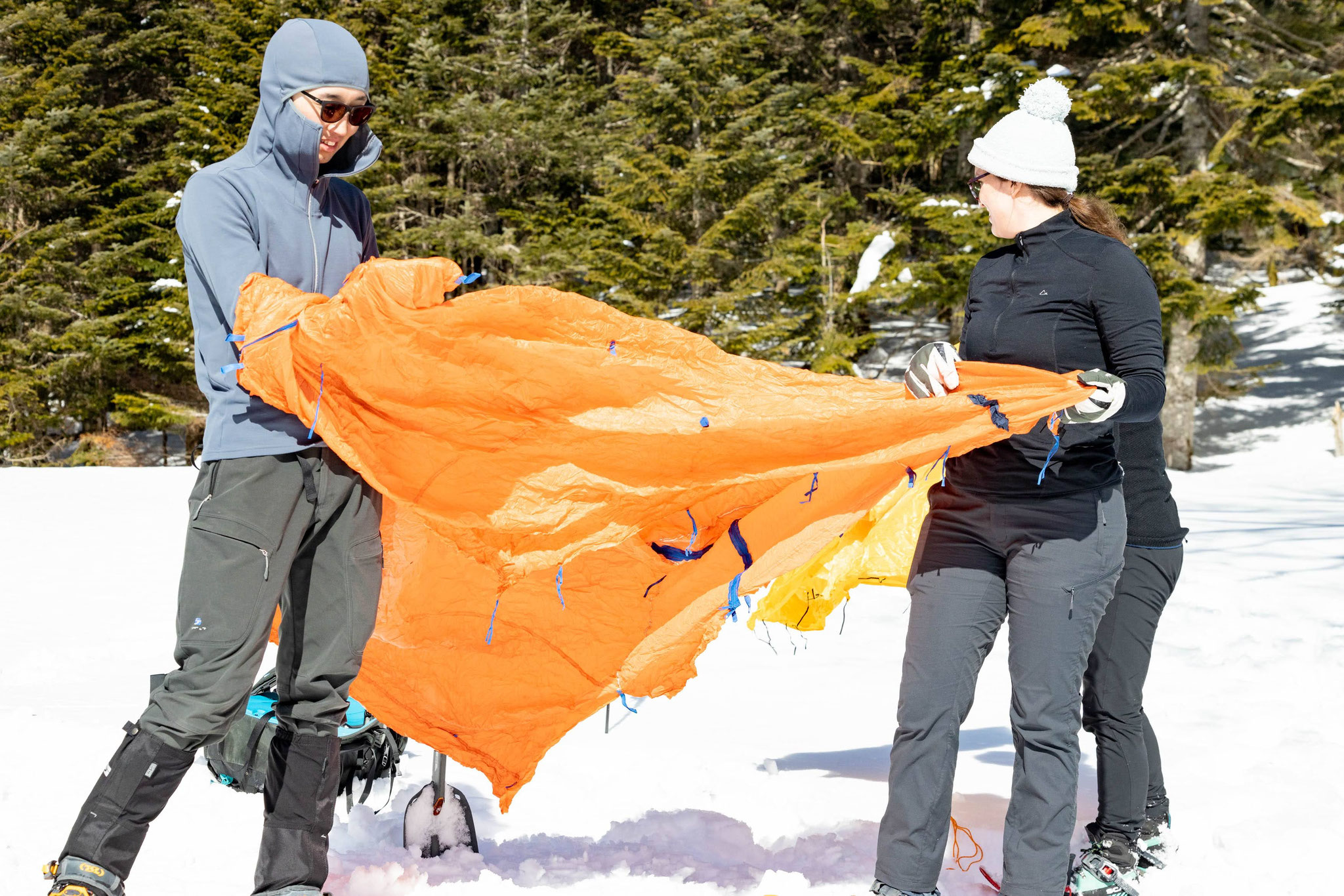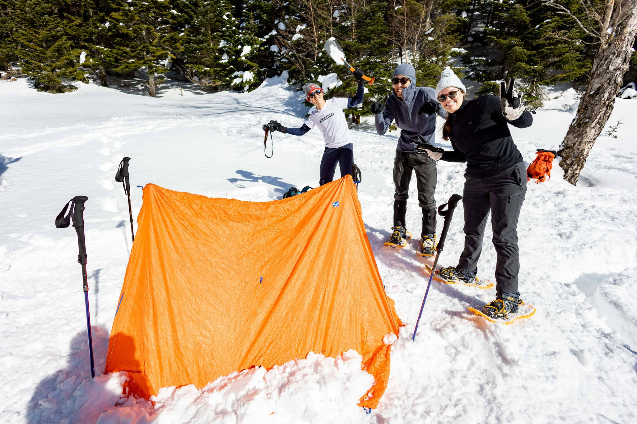 初日は夏沢鉱泉から出発し、しらびその森を散策しながら短いコースを歩きます。「雪山遊び+ちょこっと雪山訓練」をテーマに、途中で雪の中でツェルトを張ってみたり、雪でテーブルを作ってみたり、色々な楽しい雪山アクティビティを体験できます。