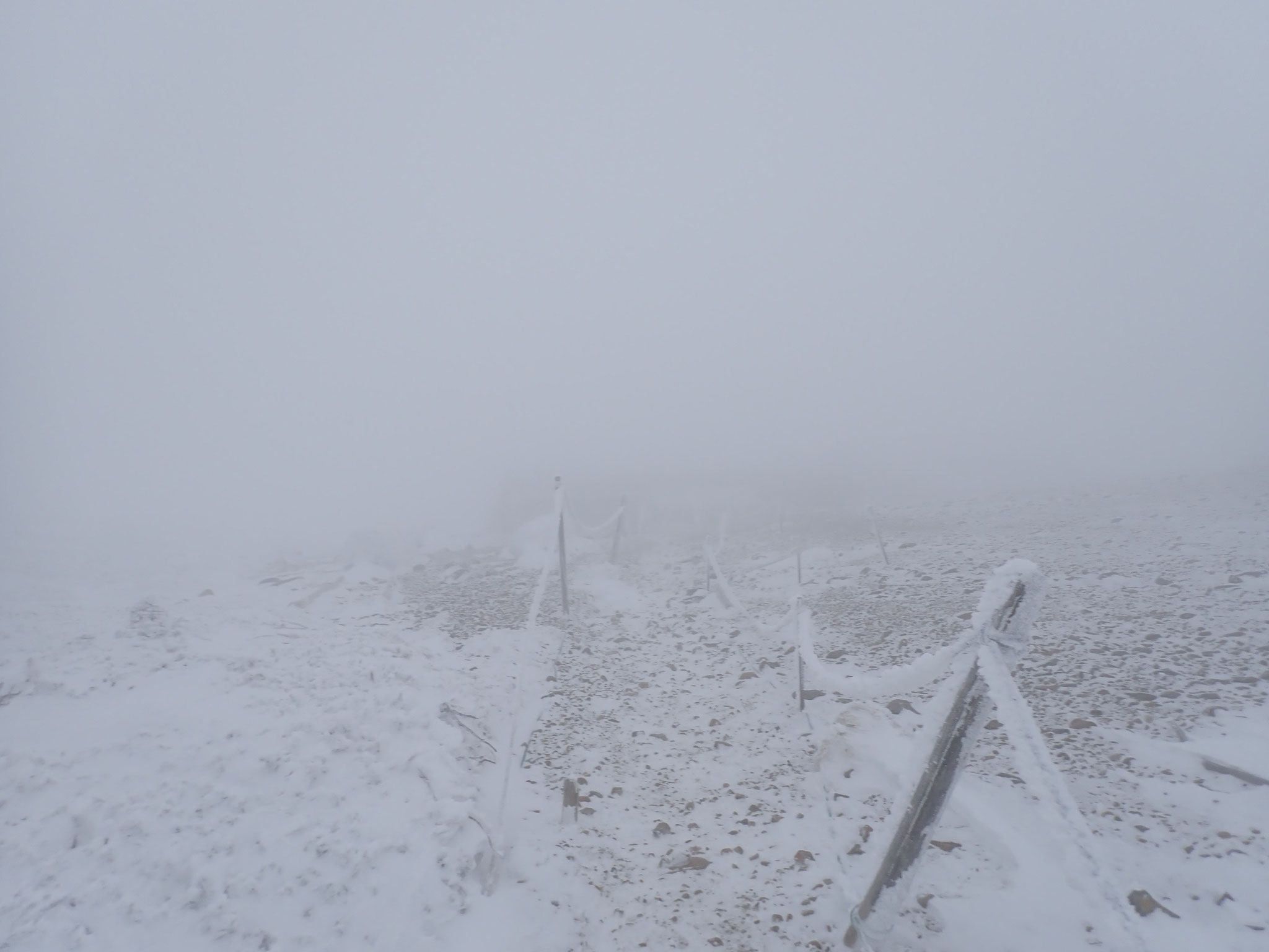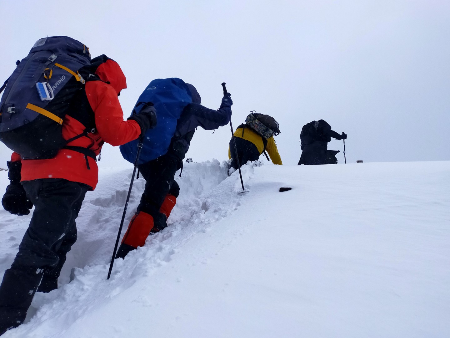 雪山装備: 防水登山靴 防寒ウェア(ダウン・フリース・手袋・帽子) スキーゴーグルまたはサングラス 軽アイゼン(またはチェインスパイク) 防水スパッツ 行動食・水筒・温かい飲み物など