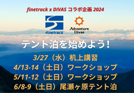 こちらのワークショップはアドベンチャーディバズとファイントラックとの特別コラボイベントです。ご自分のテントをお持ちでない方、もしくはファイントラックの「カミナドーム」テントを試してみたい方は無料貸出しがあります!購入前、買い替え前に試してみる良い機会ですのでどうぞお試しください。(数に限りがあり、先着順となりますのでお申込みはどうぞお早めに!)