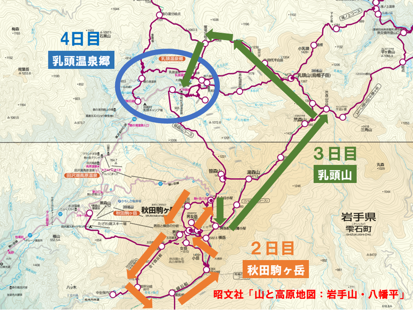 秋田駒ヶ岳&乳頭温泉コース 歩行距離: 約35km 最高標高:1637m(男女岳 ) 累計標高:上り約1905m、下り約2490m